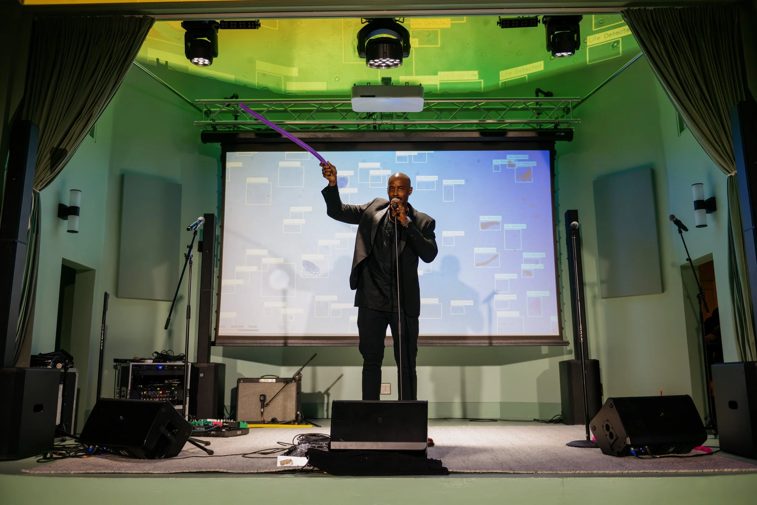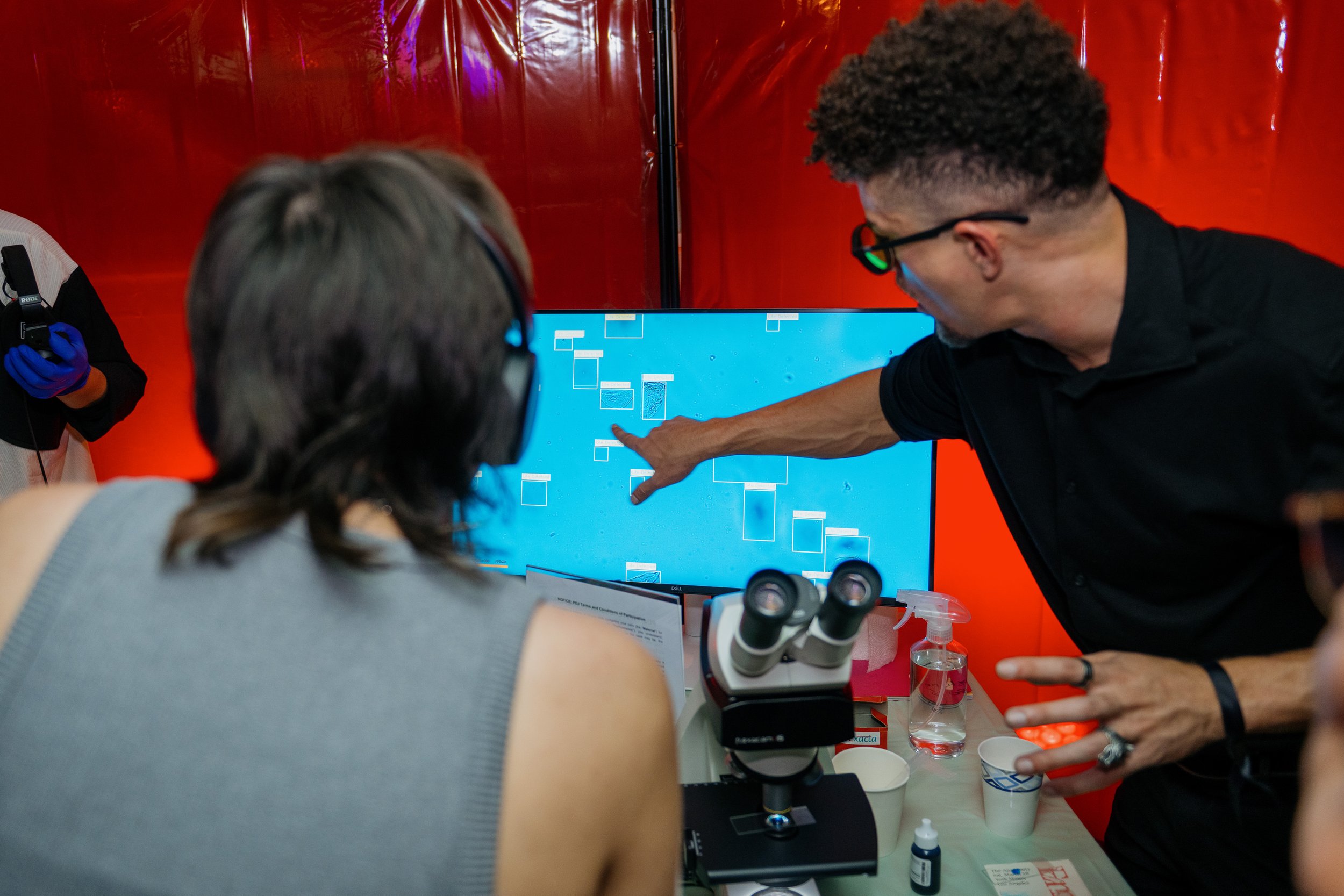 pDJ (petri dish DJ) was a bioimmersive experience designed for the Emergence: The After Party event during the Emergence catalogue launch. The public was invited to discover the unseen cycles of life and death taking place inside their own bodies by having saliva samples amplified under the microscope and projected on the venue.